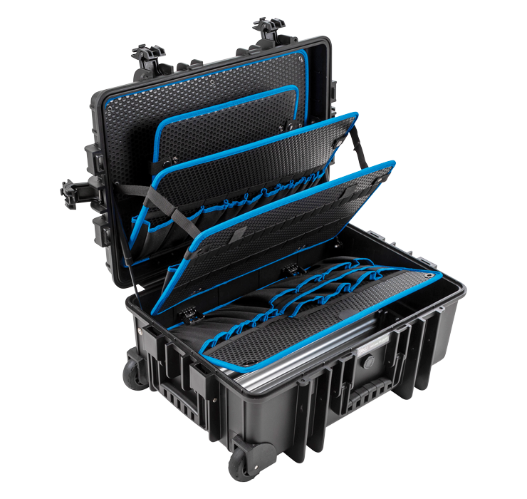 本B&W工具箱Jumbo 6600和Jumbo 6700采用聚丙烯(PP)材料制造,稳定性高、可堆叠、防尘。气压弹簧、平稳运行的轮子以及双组分手柄保证了使用时的舒适度和便捷性。结合工具板和铝插板系统,使得工具箱内物品井然有序且清晰易见。