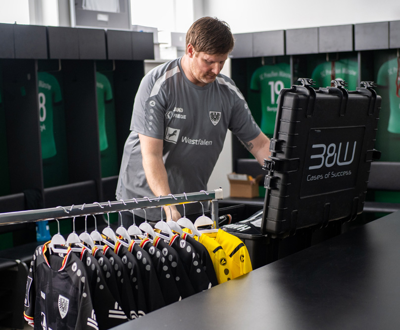 所有关键岗位——从现场播报员到媒体团队——都能从这些坚固的箱体解决方案中受益。器材经理赫尔格·达姆斯尤其青睐定制款箱体,能够以安全有序的方式运输全队装备。这些解决方案使他能高效管理从比赛球衣到训练器材的所有物资,而这正是取得赛场成功的关键保障。